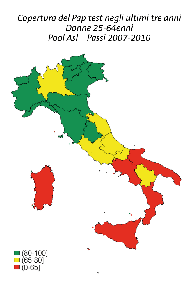 Nel 2007, i decessi per cancro della cervice uterina in Italia sono stati ancora 471. Eppure, almeno teoricamente, la mortalità per cancro del collo dell’utero sarebbe del tutto evitabile grazie alla diagnosi precoce con Pap test, la cui esecuzione è raccomandata ogni tre anni alle donne, a partire dai 25 anni fino ai 64 anni di età. In Italia, il ministero della Salute raccomanda ai servizi sanitari (vedi il documento completo o il vademecum) l’esecuzione di screening di popolazione, cioè un programma organizzato in cui le donne nella fascia d’età a rischio vengono invitate a intervalli regolari per fare il Pap test. Tuttavia il Pap test viene effettuato anche al di fuori di programmi organizzati, su iniziativa personale della donna, nell’ambito del rapporto con il proprio ginecologo o in altri contesti. L’Osservatorio nazionale screening svolge il monitoraggio dell’andamento di questi programmi: nel 2009 le donne italiane di 25-64 anni, residenti in aree dove è attivo un programma di screening organizzato, erano più di 13 milioni (78,4% della popolazione target). L’estensione dei programmi è ormai ampia nelle Regioni del Nord e del Centro Italia e gradualmente aumenta anche in quelle meridionali. Il sistema Passi rileva, richiedendolo direttamente alle donne, se e quando è stato effettuato il Pap test e se è stato eseguito all’interno del programma di screening organizzato dalla Asl oppure su iniziativa personale.