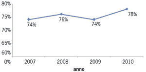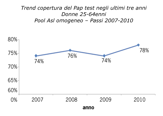 Per un confronto interregionale più attendibile, la copertura del Pap test negli ultimi tre anni è stata calcolata anche sul pool quadriennale (2007-2010), come illustra la figura.