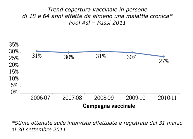 Tuttavia, mentre è facile calcolare le coperture vaccinali tra le persone con più di 64 anni (per la presenza di dati affidabili sul numero di persone residenti in questa fascia di età), non esistono invece dati altrettanto solidi sulla copertura vaccinale degli adulti tra i 18 e i 64 anni affetti da malattie croniche, a causa delle difficoltà a stimare il numero complessivo di persone che rientrano in questa definizione e che quindi dovrebbero vaccinarsi. Al momento, Passi è l’unico sistema informativo che può fornire una stima tempestiva della copertura vaccinale tra gli adulti con e senza malattie croniche. Le stime di copertura sono ricavate dalle 12.996 interviste effettuate e registrate dal 31 marzo 2011 al 30 settembre 2011 nella popolazione 18-64 anni [1].