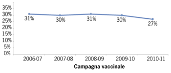 Considerando solo le Asl che hanno partecipato alla sorveglianza per l’intero periodo 2007-2010 (pool omogeneo) , la copertura vaccinale nella campagna 2010-11 è leggermente più bassa (27%) rispetto ai valori delle precedenti campagne, ma questa diminuzione non è statisticamente significativa [3]: