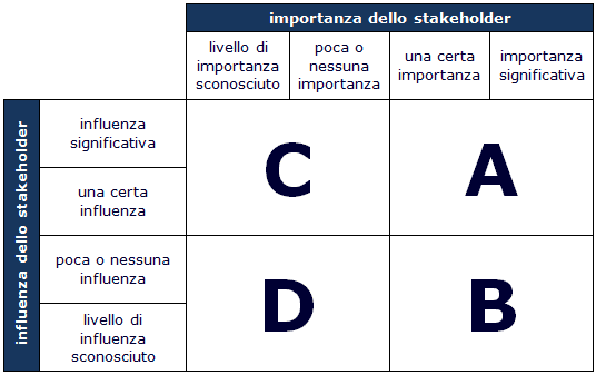 13 maggio 2010 - Un metodo comune per l’analisi degli stakeholder si basa su una matrice che consente di confrontare i vari soggetti su due assi: l’importanza contro l’influenza della parte interessata.