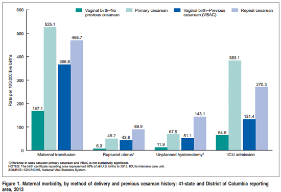 Le donne che hanno partorito per via vaginale, senza pregressi TC, confrontate con quelle che hanno partorito mediante TC, presentano tassi più bassi per le quattro morbosità. Anche le donne già cesarizzate che partoriscono per via vaginale hanno una minore incidenza di morbosità rispetto a quelle che si sottopongono a un cesareo ripetuto. Tra le donne che a causa del fallimento del travaglio di prova si sottopongono a un cesareo d’urgenza la morbosità è maggiore, specialmente per le rotture d’utero che, pur essendo molto rare, sono 7 volte più frequenti rispetto alle donne che effettuano un TC programmato.