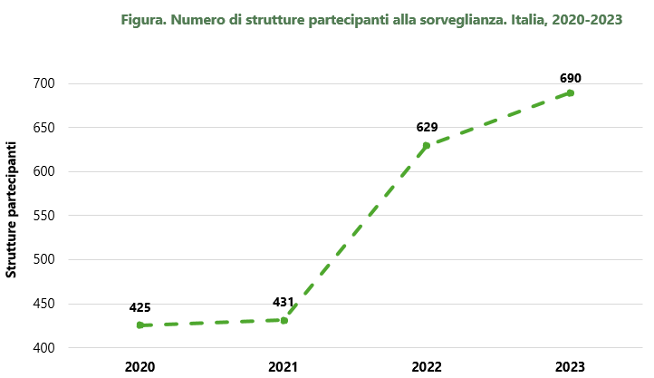 In Italia, nel 2023, i dati relativi al consumo di soluzione idroalcolica per l’igiene delle mani in ambito ospedaliero, sono stati forniti da un totale di 690 strutture di 20 Regioni/PA, osservando un graduale aumento dal 2020.