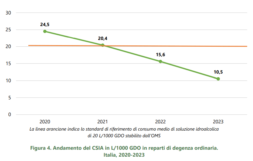 Il consumo mediano nazionale di soluzione idroalcolica nel 2023 per l’intera struttura è stato di 17,2 L/1000 GDO, 10,5 L/1000 GDO per la degenza ordinaria, 9,6 L/1000 GDO per l’area medica, 11,0 L/1000 GDO per l’area chirurgica, 39,9 L/1000 GDO per l’area di terapia intensiva e 8,9 L/1000 GDO per l’area ortopedica.