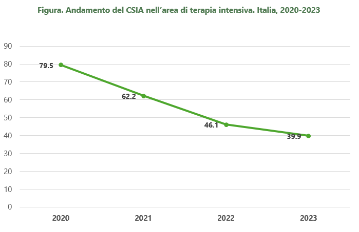 Considerando solo la degenza ordinaria si è notato un calo progressivo del CSIA: nel 2020 e nel 2021 il consumo mediano di soluzione idroalcolica era superiore alla soglia di 20 L/1000 GDO, rispettivamente 24,5 L/1000 GDO e 20,4 L/1000 GDO, mentre nel 2022 e 2023 è stato sotto la soglia (rispettivamente 15,6 L/1000 GDO e 10,5 L/1000 GDO).