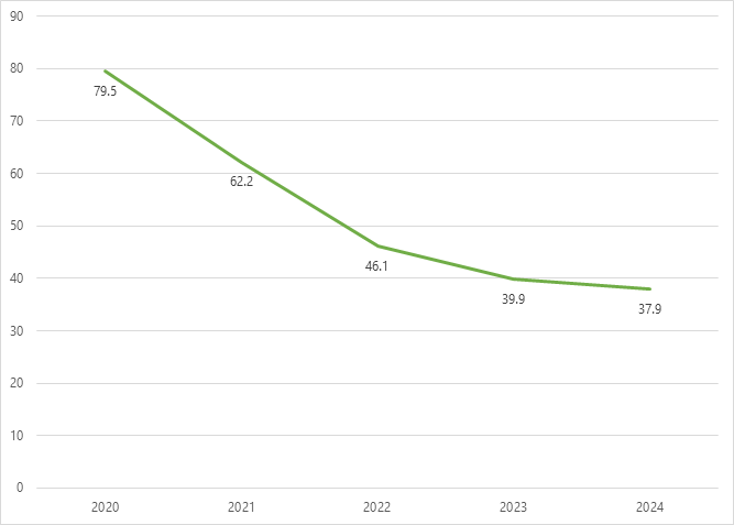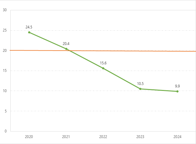 Considerando solo la degenza ordinaria, si è notato un calo progressivo del CSIA (Figura 4): nel 2020 e nel 2021 il consumo mediano di soluzione idroalcolica era superiore alla soglia di 20 L/1000 GDO, rispettivamente 24,5 L/1000 GDO e 20,4 L/1000 GDO, mentre nel 2022, 2023 e 2024 è stato sotto la soglia (rispettivamente 15,6 L/1000 GDO e 10,5 L/1000 GDO, 9,9 L/1000 GDO).