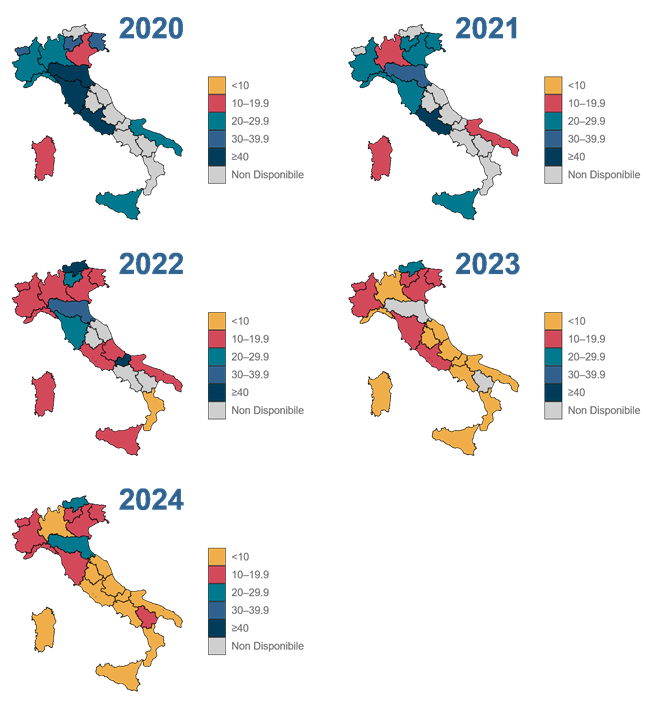 Alcuni cambiamenti nella metodologia di raccolta e analisi dei dati nel corso degli anni, tra cui l’implementazione della piattaforma di raccolta dei dati nel 2022, che ha permesso una sorveglianza più capillare ed efficace, consentendo alle Regioni una maggiore facilità di comunicazione dei dati, potrebbero spiegare l’aumento della partecipazione registrata.