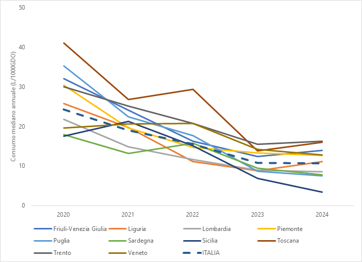 Il consumo registrato nel 2020 potrebbe essere conseguenza della campagna di sensibilizzazione rivolta agli operatori sanitari, svoltasi all’inizio della pandemia di COVID-19, sull’igiene delle mani, che ha contribuito a mantenere valori di consumo elevati. Con la fine dell’emergenza pandemica, l’attenzione alle strategie di prevenzione è calata, il che potrebbe spiegare la diminuzione del suo consumo registrata nel sistema di sorveglianza dal 2021 in poi.