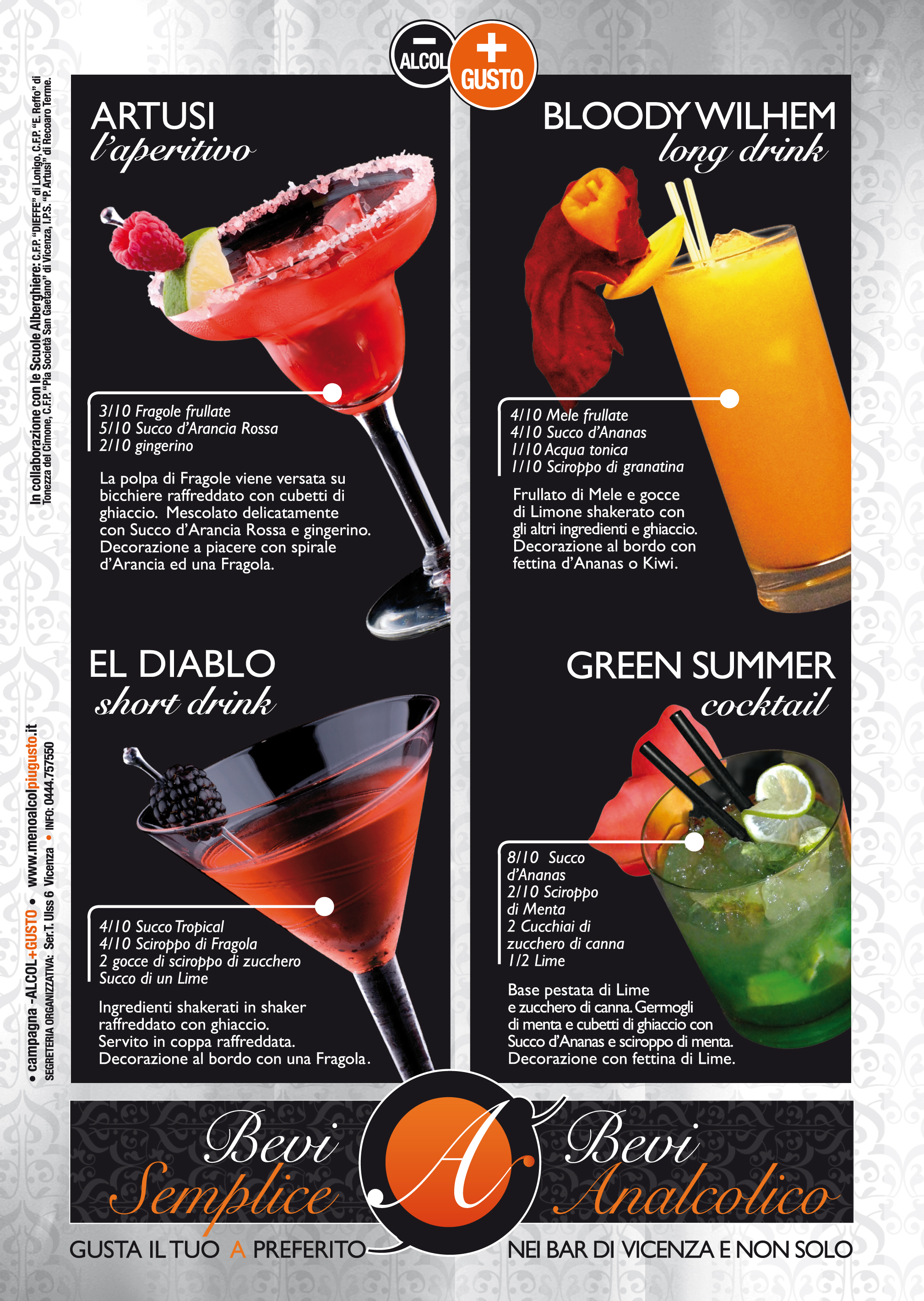 Promossa dal gruppo alcologia del dipartimento per le dipendenze dell'Ulss 6 di Vicenza, l’edizione 2010 allarga la rete dei promotori di iniziative di oltre il 20% rispetto al 2009: 118 gli enti, associazioni, gruppi, persone che hanno deciso di partecipare attivamente alla campagna divenendo a loro volta dei testimonial. Scarica anche la locandina con i menu di drink analcolici (pdf 2,4 Mb) e la locandina “Bevi semplice, bevi analcolico” (pdf 2 Mb).