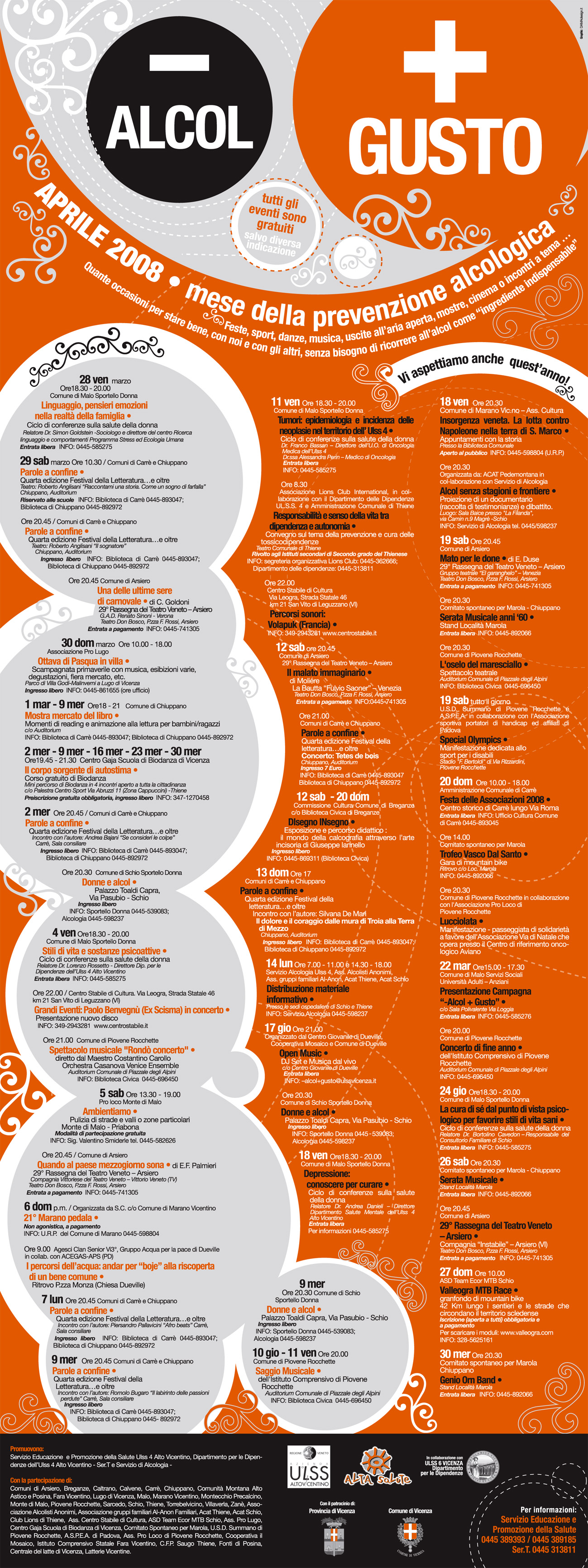 Aprile all’insegna della prevenzione alcologica, con la campagna “-alcol, +gusto”. Il messaggio: trovare momenti e motivi di aggregazione alternativi. A Vicenza il gruppo alcologia del dipartimento Dipendenze ha deciso di sostenere e promuovere iniziative di associazioni ed enti locali. Leggi la presentazione della campagna (pdf 272 kb) e guarda la locandina (pdf 1,9 Mb) con tutte le iniziative in programma.
