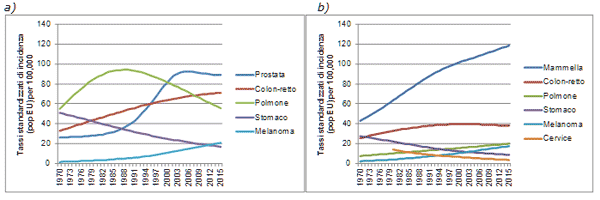 Figura 1: Stime di incidenza in Italia per sede tumorale nel periodo 1970-2015 negli uomini a) e nelle donne b). Tassi standardizzati (popolazione standard Europea) per 100,000 anni-persona.