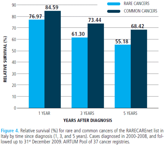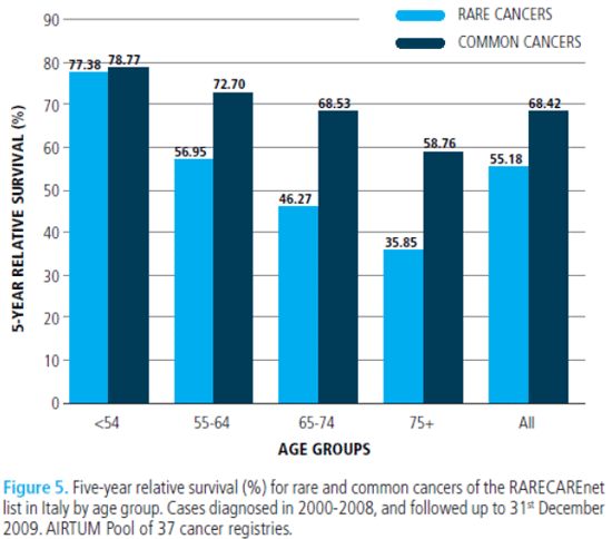 Lo studio mostra una sopravvivenza inferiore per i tumori rari (71%) rispetto a quelli frequenti (85%) già dopo 1 anno dalla diagnosi. Tale differenza continua a crescere fino a 3 anni (61% vs 73%) per restare costante da 3 a 5 anni dopo la diagnosi. La differenza riscontrata tra tumori rari e frequenti, nella sopravvivenza a 5 anni dalla diagnosi, cresce all’aumentare dell’età alla diagnosi.