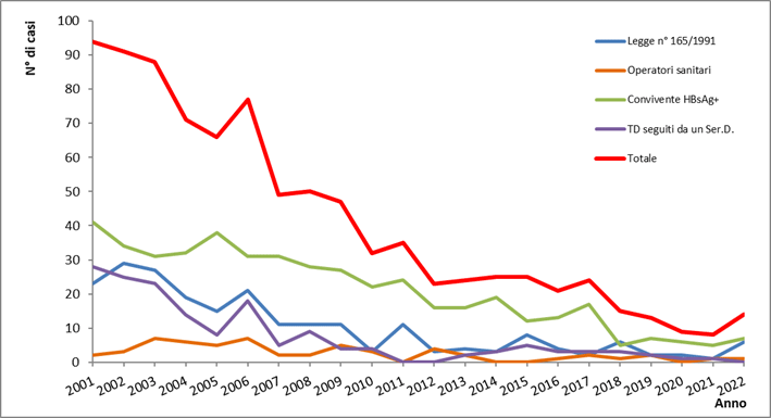 Nella figura sono riportati i trend dei casi riportati tra quattro categorie di persone che, per un motivo specifico, dovrebbero vaccinarsi contro l’infezione da Hbv, poiché considerati gruppi a maggior rischio, o per l’obbligo vaccinale: