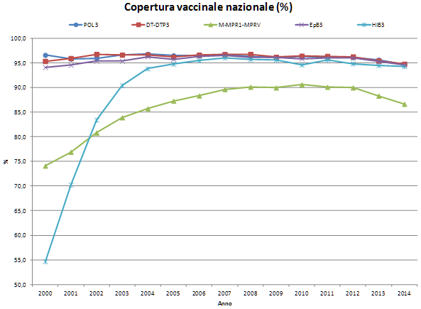 Un’analisi retrospettiva delle coperture nazionali dal 2000 al 2014 evidenzia la presenza di due fasi temporali (vedi figura 1):