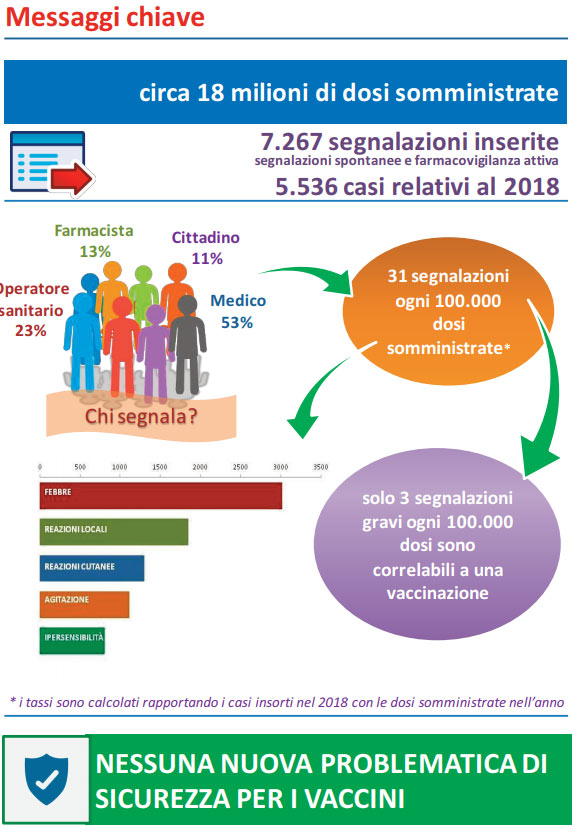 Su un totale di circa 18 milioni di dosi somministrate per tutte le tipologie di vaccino sono state riscontrate 31 segnalazioni ogni 100.000 dosi, ovvero circa 12 segnalazioni ogni 100.000 abitanti.