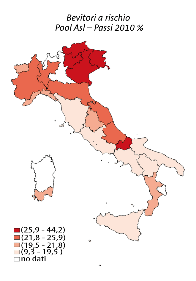 La mappa riporta la situazione relativa alla percentuale di persone da considerare bevitori a rischio nelle Regioni e Asl che nel 2010 hanno raccolto un campione rappresentativo. Il range varia dal 9% della Campania al 44% della P.A. di Bolzano. Si osservano differenze statisticamente significative nel confronto tra le Regioni, con un gradiente Sud-Nord.