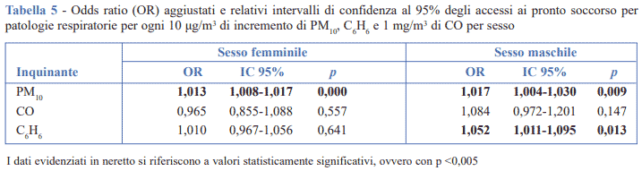 Il PM10 risulta positivamente associato a un incremento significativo di rischio sia per il genere femminile (OR = 1,013; IC 95%: 1,008- 1,017) sia per il genere maschile (OR = 1,017; IC 95%: 1.004-1.030), mentre il C6H6 per il genere maschile (OR = 1,052; IC 95%: 1,011-1.095). L’incremento di rischio correlato alle concentrazioni di CO, stratificato per genere, è emerso per il genere maschile, sebbene non significativo (OR = 1,084; IC 5%: 0,972-1,201; Tabella 5).