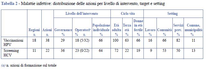La distribuzione per livello di intervento mostra una contenuta variabilità geografica rispetto alla media nazionale; il Centro e il Nord-Ovest sono maggiormente orientati verso azioni sulla popolazione/individuo e il Nord-Est più sbilanciato sul livello governance. Il coinvolgimento degli operatori è contenuto, in generale, e si qualifica interamente come formazione degli operatori sanitari.