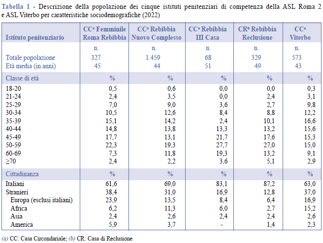 In Tabella 1 è descritta la popolazione detenuta nel 2022 nei cinque istituti penitenziari della ASL Roma 2 e della ASL Viterbo, distinta per alcune caratteristiche sociodemografiche. Nel complesso, l’età media è superiore a 40 anni, con un valore minimo di 43 anni nella CC Viterbo e massimo di 51 anni nella CC Rebibbia III Casa.