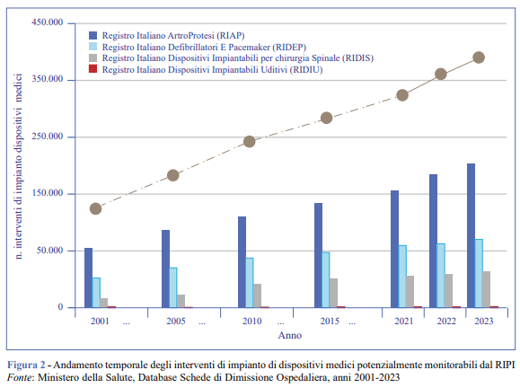 The RIAP architecture, defined by three pillars (a federation of regional registries; data collection based on HDR integrated by a minimum dataset of additional data; and identification and characterisation of implanted devices using a dedicated database), was used to design the other registries included in RIPI. The national implant volume of RIPI was analysed (2001-2023) and its impact on public health expenditure was estimated.