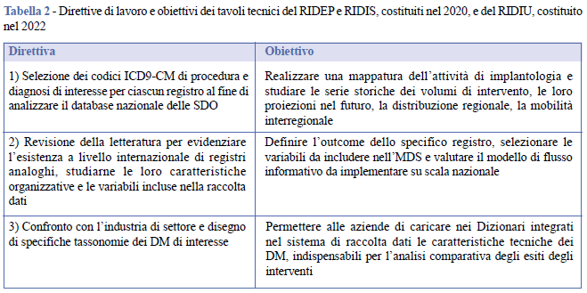A partire dal 2020, sono stati costituiti i tavoli tecnici per definire le basi progettuali dei nuovi registri da includere nel RIPI in aggiunta al RIAP, verificando che fossero applicabili le linee di indirizzo già definite per il RIAP (6). I tavoli tecnici di RIDEP, RIDIS e RIDIU hanno lavorato seguendo tre direttive (Tabella 2) mirate a: 1) quantificare il numero di interventi e la loro distribuzione regionale per confermare la validità del modello di flusso adottato; 2) definire le variabili da includere nell’MDS aggiuntivo alla SDO, sulla base delle evidenze scientifiche disponibili anche a livello internazionale; 3) progettare tassonomie come base strutturale dei Dizionari in cui ciascun dispositivo caricato dal fabbricante/distributore possa essere classificato e corredato delle caratteristiche tecniche utili alla sua successiva valutazione. Contestualmente, l’infrastruttura informatica del RIAP, e quindi del RIPI, si è evoluta progressivamente secondo i principi dell’ingegneria del software, in modo da favorirne l’integrazione nei flussi informativi sanitari correnti.