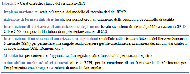 π-RIPI rappresenta una svolta strategica per la digitalizzazione e l’integrazione dei registri dei DM impiantabili e ha l’obiettivo di creare una piattaforma di gestione dei dati unica, interconnessa, modulare e scalabile, progettata seguendo i principi di sicurezza e interoperabilità by design e capace di aggregare registri settoriali in un ecosistema digitale integrato (Tabella 3).