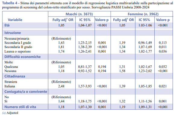 Per stimare i determinanti della partecipazione allo screening del CCR è stato utilizzato un modello di regressione logistica multivariabile e nei risultati sono stati riportati gli Odds Ratio (OR) aggiustati e i relativi intervalli di confidenza al 95% (IC 95%) per tutte le variabili indipendenti considerate (fully adjusted). Il modello di regressione multivariabile è stato eseguito sia nel totale del campione che disaggregato per maschi e femmine. Il modello utilizza come variabile di outcome l’esecuzione di un test di screening per la prevenzione del CCR all'interno del programma organizzato e come variabili indipendenti età, sesso, cittadinanza, difficoltà economiche, essere coniugato o convivente e numero di stili di vita corretti.