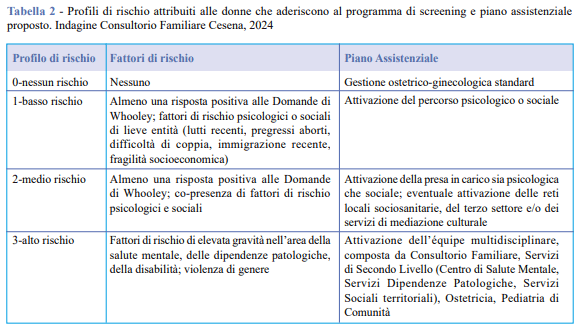 Alle donne con risultato positivo allo screening del disagio emotivo e/o con presenza di fattori di rischio psicologici e sociali alla valutazione effettuata dall’ostetrica presso il Consultorio Familiare, o presso altri nodi della rete, è stato attribuito un profilo di rischio, descritto nella Tabella 2.