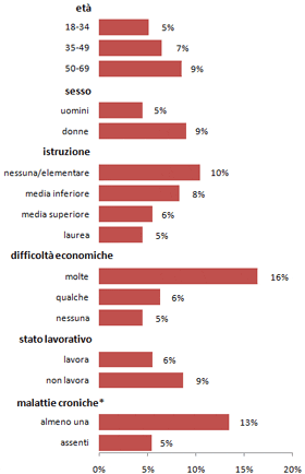 Tenendo conto delle interazioni tra questi fattori con un’analisi multivariata, si conferma l’associazione dei sintomi di depressione con il sesso, il livello di istruzione, le difficoltà economiche e la presenza di malattie croniche. Non è invece confermata l’associazione con l’età e con lo stato lavorativo.